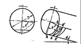 另外筒體的長(zhǎng)度、直徑、筒體對(duì)水平面的傾角、轉(zhuǎn)速、物料的自然休止角以及氣流速度等因素也對(duì)物料在圓筒內(nèi)所停留的時(shí)間有所影響。我們可按下法來估算,如圖2-1所示,當(dāng)筒體旋轉(zhuǎn)時(shí),某一物料顆粒,由A點(diǎn)升高到B點(diǎn)。升舉的高度決定于角θ,而角θ由物料與筒壁間的摩擦系數(shù)和該物料顆粒對(duì)筒壁的正壓力來確定。當(dāng)筒體回轉(zhuǎn)的角度很小時(shí),對(duì)粉料來說,角θ實(shí)際上就是物料的自然休止角。顆粒被升到B點(diǎn)后,物料在重力作用下,沿著物料的傾斜表面滾落下來,又由于筒體的傾角α滑落到A’點(diǎn),再被升高到B’點(diǎn),隨后滾落到A”點(diǎn),如此周而復(fù)始,直到從筒體低端滾出。
