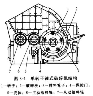 轉(zhuǎn)子錘式破碎機(jī)的主要結(jié)構(gòu)由轉(zhuǎn)子、破碎板、排料篦子、保險(xiǎn)門(mén)、給料輥、殼體和驅(qū)動(dòng)部分等部件組。見(jiàn)圖3-4。